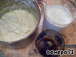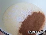 Яйца взбить с сахаром в крутую пену, добавить разрыхлитель и какао, размешать. Сливочное масло растопить и смешать с молоком.