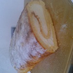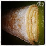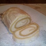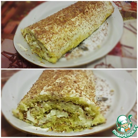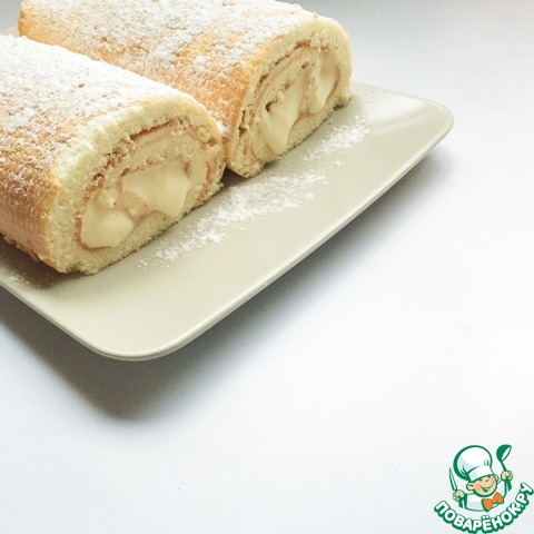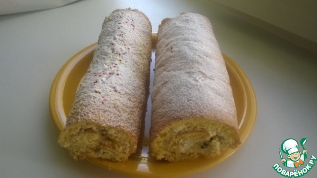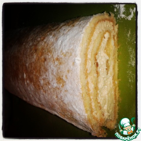 Раскручиваем и выкладываем крем, распределяя ножом по всей поверхности. Скручиваем и в холодильник на час-другой. Посыпать сахарной пудрой.