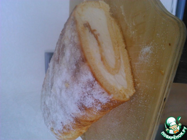 Достаем противень из духовки. Полотенце посыпаем сахарной пудрой и переворачиваем на него испеченный корж, бумагу (коврик) снимаем, скатываем в рулет вместе с полотенцем. Даем остыть 2-3 минуты.