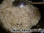 Всыпать его в сковороду с луком и, помешивая, прогреть рис, чтобы он пропитался маслом, минуты 2.