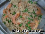 Добавить креветки (прямо замороженные), соль, перец. Перемешать.