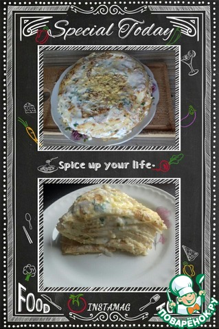 И так делаем, пока не закончится тесто. Последний блин кладем сверху торта и посыпаем зеленью и сыром.