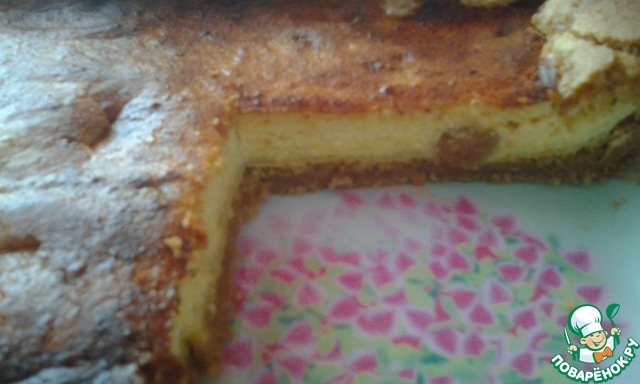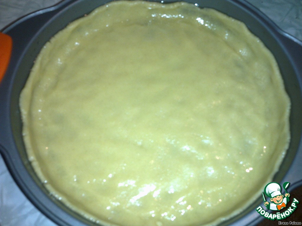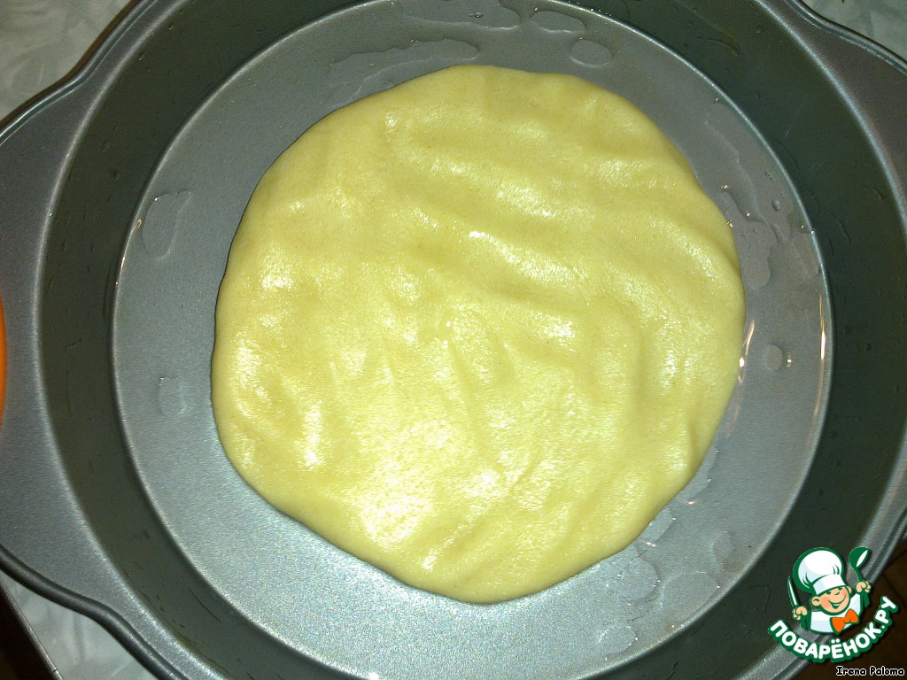 (Моя новая форма оказалась немного великовата, и бортики у меня чисто символические, но это не страшно!) Да, надо отметить, что разьемная форма идеальна для такой выпечки! Я вот оплошала, т. к. достать пирог переворачиванием формы здесь не выйдет (очень он нежный), и советую либо форму взять, в которой не жалко будет резать, либо застелить форму бумагой так, чтобы края ее торчали и за них можно было достать пирожок!