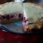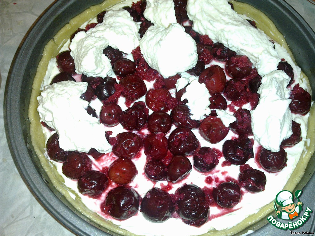 На тесто выкладываем половину творожной начинки, на нее вишню (т. к. вишня была кисловата, я присыпала сахаром и немного панировочными сухарями). Поверх вишни выкладываем оставшуюся начинку, разравниваем и в духовку.
