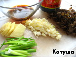 Пока варился рис, мы приготовили всё остальное. Главное в китайской кухне - все ингредиенты должны быть подготовлены до начала готовки, так как сам процесс термической обработки занимает, в основном, считанные минуты. Итак: грибы - промыть, нарезать на тонкую лапшу, удаляя твёрдое основание. Чеснок - раздавить, нарезать не мелко. Имбирь - чистим; если молодой, то натрём на тёрке, если старый, как у меня, режем на кусочки, а после обжарки достанем. Перья лука - помоем, нарежем.