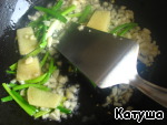 На сковородку наливаем масло, через 5 секунд - чеснок, имбирь, часть лука. Как только почувствуем, что чеснок хочет румяниться, примерно через минуту,