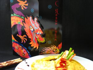 Пока готовилась начинка, мы умудрились накалить плоскую сковороду для омлета. Здесь тоже есть секрет. Успех омлета в простых правилах: 1. раскалить сковороду, влить масло, 2. налить яичную смесь, распределить по всей сковородке и 3. встряхнуть из стороны в сторону. 4. выключить огонь и накрыть на несколько секунд крышкой. Всё! Омлет готов за считанные секунды.