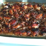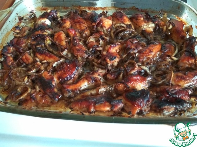 Разогреть духовку до 200 град. Выложить в подходящую посудину курицу и залить маринадом, лук выложить сверху. Запекать в духовке приблизительно час. При этом периодически поливая выделяющимся соком. Когда увидите, что сок от крылышек стал тягучим, то пора вынимать.