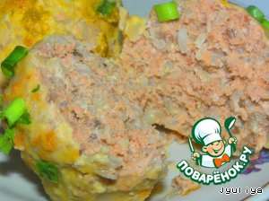Филе горбуши прокрутить на мясорубке + капуста + 1 луковица. Посолить, поперчить, добавить рис, тщательно перемешать.