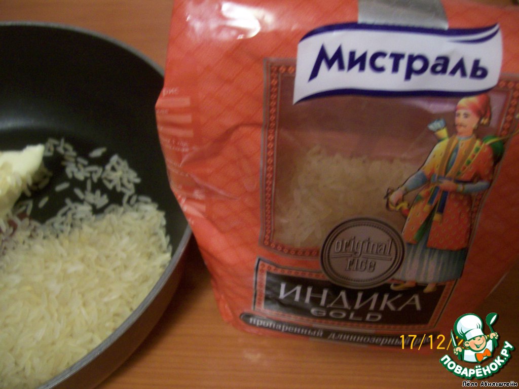 В это время обжариваем в масле белый рис (у меня индика), 2 минутки.