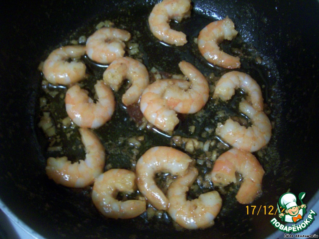 Добавляем креветки, солим, перчим, обжариваем 1-2 минутки.