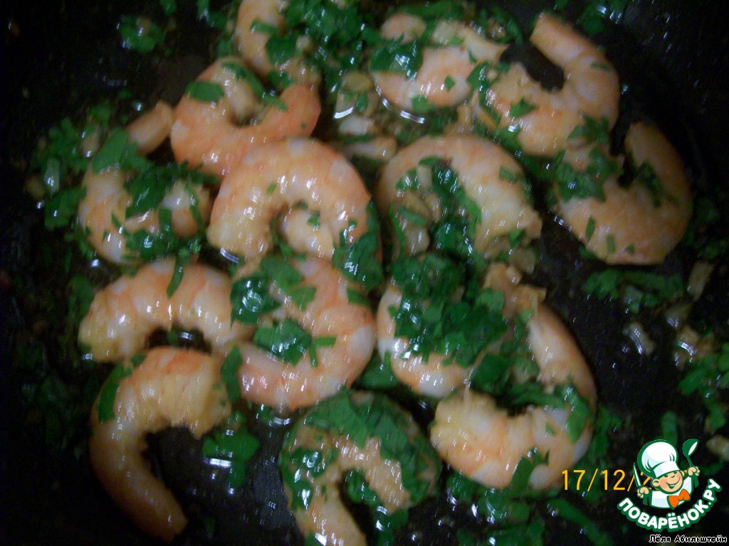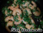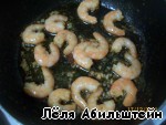 Добавляем к креветкам, перемешиваем, выключаем огонь.