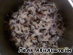 Слить воду. Рис разбух, или, как говорят про этот сорт, раскрылся. Замачивание необходимо для размягчения, так как дикий рис без этого очень долго варится.