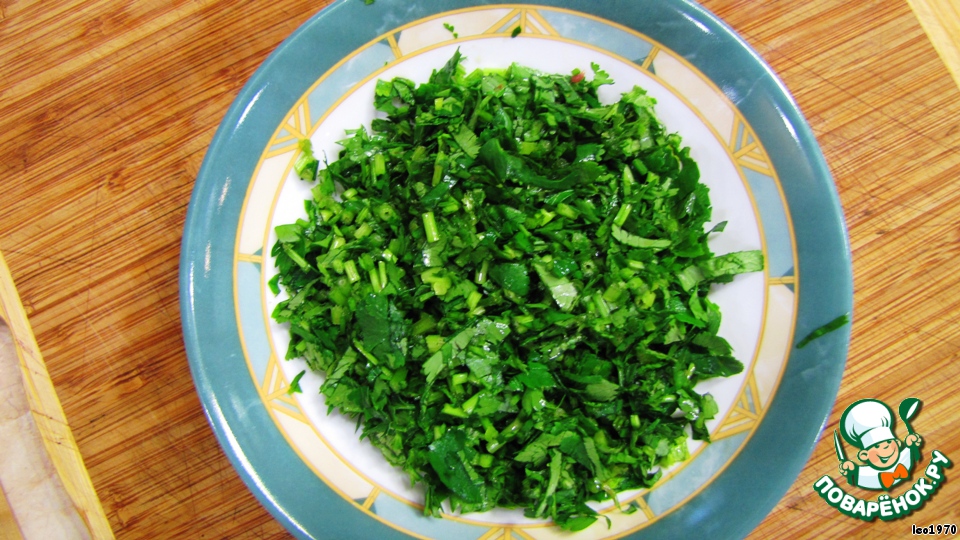 Порубите зелень. Рубите зелень вместе со стеблями, т. к. вся зелень сразу кладется в мясо и она станет мягкой и стебли чувствоваться не будут.