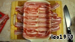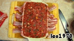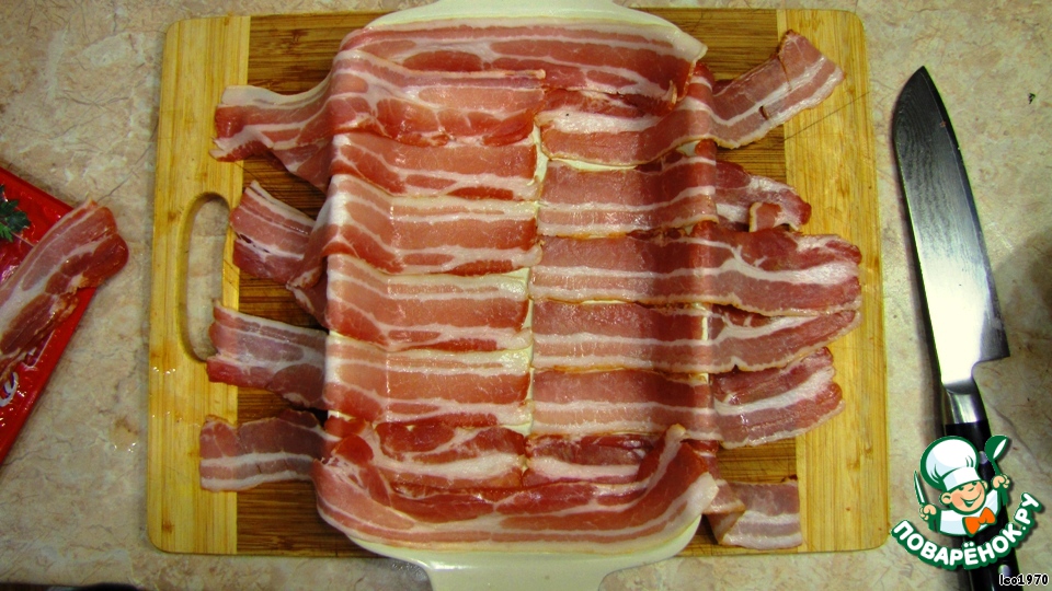 Перемешайте хорошенько. Возьмите прямоугольную или другую форму такого размера, чтобы весь фарш поместился в нее. Выложите бекон таким образом, чтобы он полностью закрыл дно формы, причем оставшиеся части смогли закрыть фарш сверху (см. фото). Торцы формы закройте двумя полосками бекона соответствующей длины.