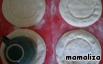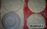 Листы слоеного теста слегка растянуть, вырезать из каждого по 2 круга.