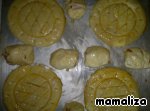 На тесте сделать фигурные насечки острым ножом. Смешать желток, немного воды, куркуму и соль. Этой смесью смазать вырезанные круги. Выпекать при 190 градусах 10 минут.