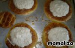 У готовых тарталеток аккуратно вынуть серединку, выложить семгу, залить сырным соусом. Накрыть крышечкой.
