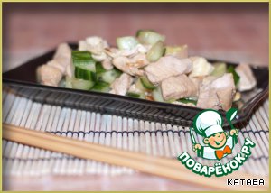 Рецепт придуман мной в японском стиле и неоднократно уже опробован. Это что-то божественное! Нежная курочка с ароматом соевого соуса, сладкий омлет и освежающий огурец! Очень хорошо такое блюдо идет в компании друзей. Можно каждому положить в тарелку, а можно из общей таскать китайскими палочками по кусочку. Отличная закуска к пиву. Кстати, блюдо диетическое, совершенно без жира.