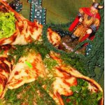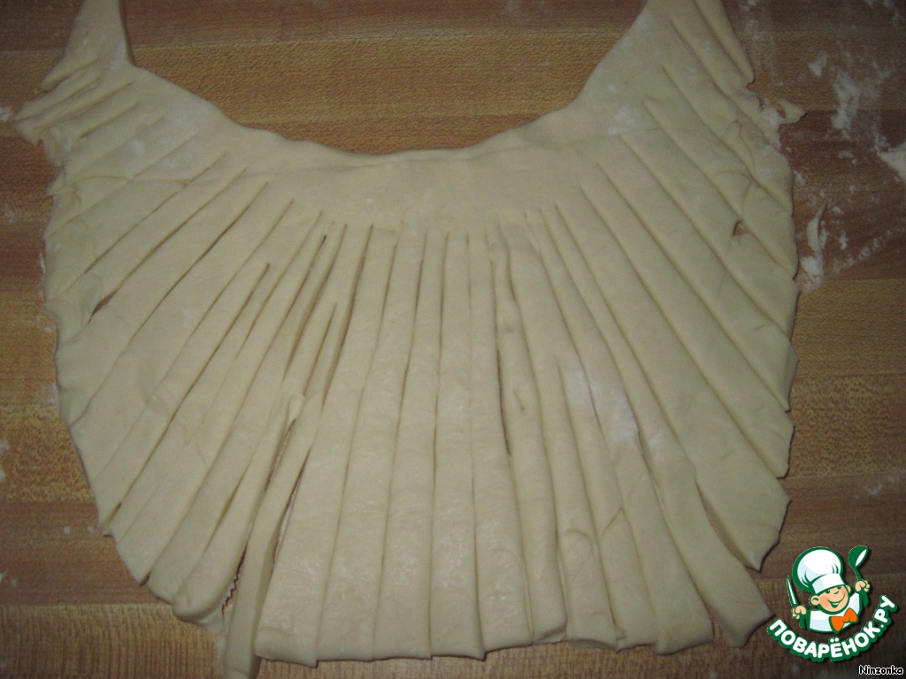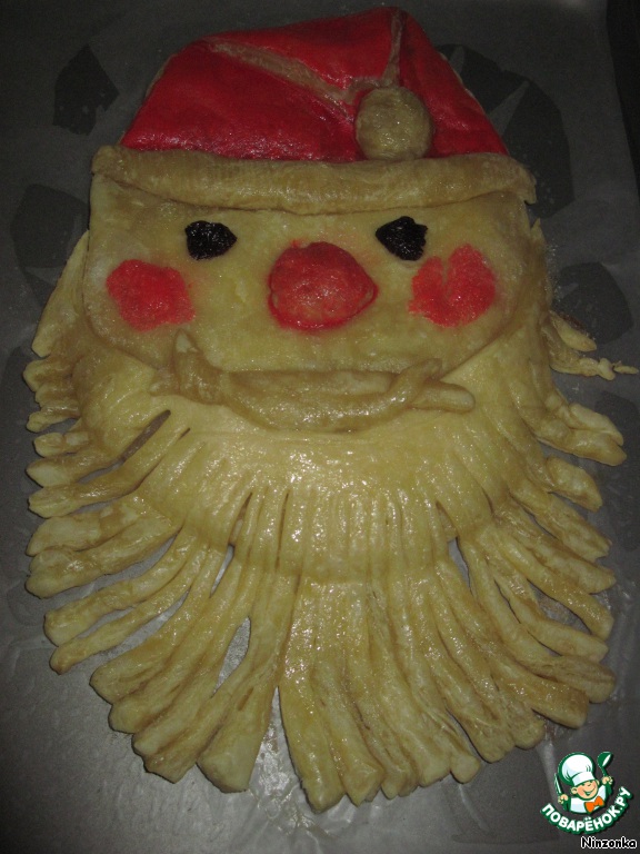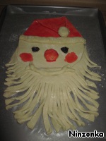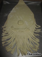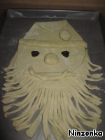 • На противень кладем бумагу для выпечки. На нее кладем голову и накладываем бороду. Полосочки бороды немного подкручиваем.