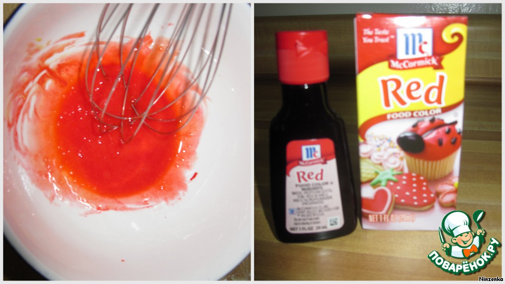 • Смазываем красным цветом шапку, нос и щеки, а белком все остальное. Сверху всего деда мороза посыпаем сахаром.