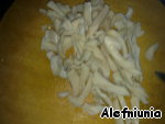 Кальмар, если свежий, то опустить в кипящую воду на 1 мин. (у меня консервированный). Откинуть на дуршлаг, промыть в холодной воде. Снять пленку и почистить внутри. Опустить в горячую подсоленную воду и кипятить 3 мин. Нарезать соломкой.