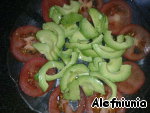 Салатные листья выложить на тарелку ( у меня кружки помидор с ломтиками огурцов). Сверху разложить авокадо,перец и кальмаров.