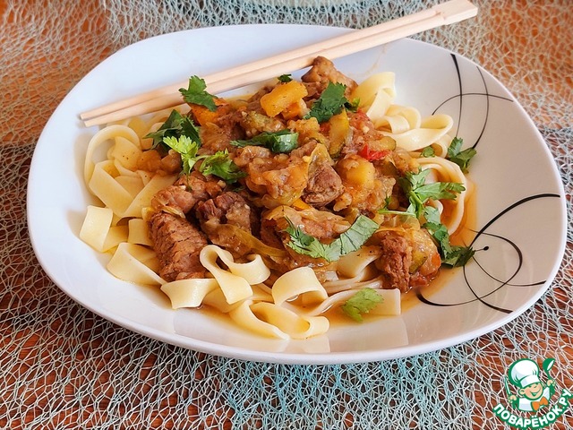 Когда соус готов, вареную лапшу окунуть в кипяток, выложить слоем на блюдо, полить соусом и посыпать зеленью.