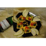 Делаем дольку арбуза из дольки помидорки, кусочка сыра и зеленого перца, черные крапинки из оливок.