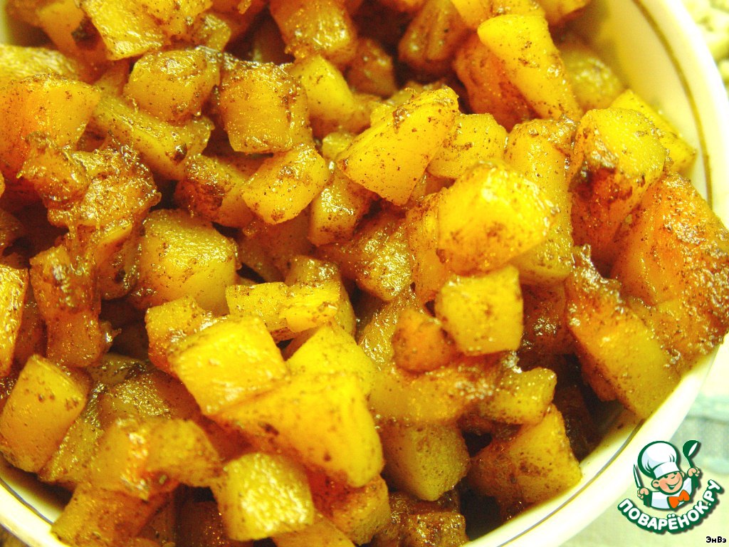На сковороде растопить 50 грамм масла, добавить тыкву. Готовить до полного выпаривания выделившейся жидкости, затем добавить сахар и корицу. Помешивая держать на огне до полной карамелизации тыквы. -
