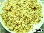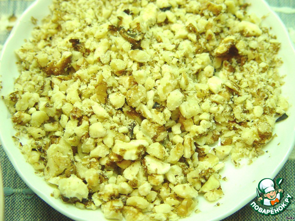 Орехи измельчить в блендере, но не в пыль, а на пару-тройку оборотов, или нарезать вручную.