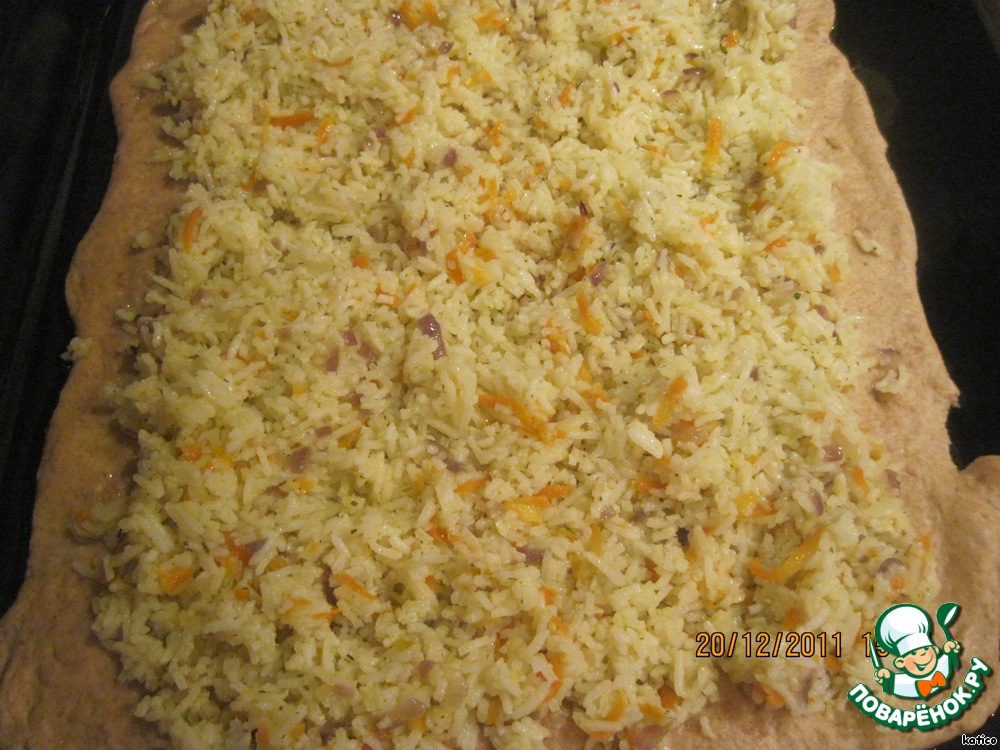 Очень-очень вкусный пирожок! Мягкое тонкое сырное тесто, начинка из ароматного риса с овощами в сливочно-яичной заливке. Нежно, ароматно и вкусно! Пирог хорош с чаем, с супом, с бульоном, удобен чтобы брать с собой. Вкусный, как в горячем, так и в холодном виде.