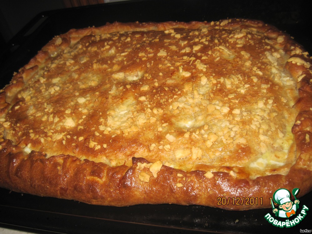 Оставшуюся часть теста также тонко раскатать, накрыть ею начинку, защипнуть края, сформировать бортик, дать пирогу подойти минут 20.