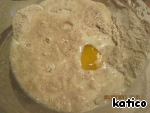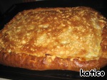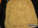 На тесто выложить начинку, равномерно полить сливочно-яичной смесью, немного смеси оставить, чтобы потом смазать пирог сверху.