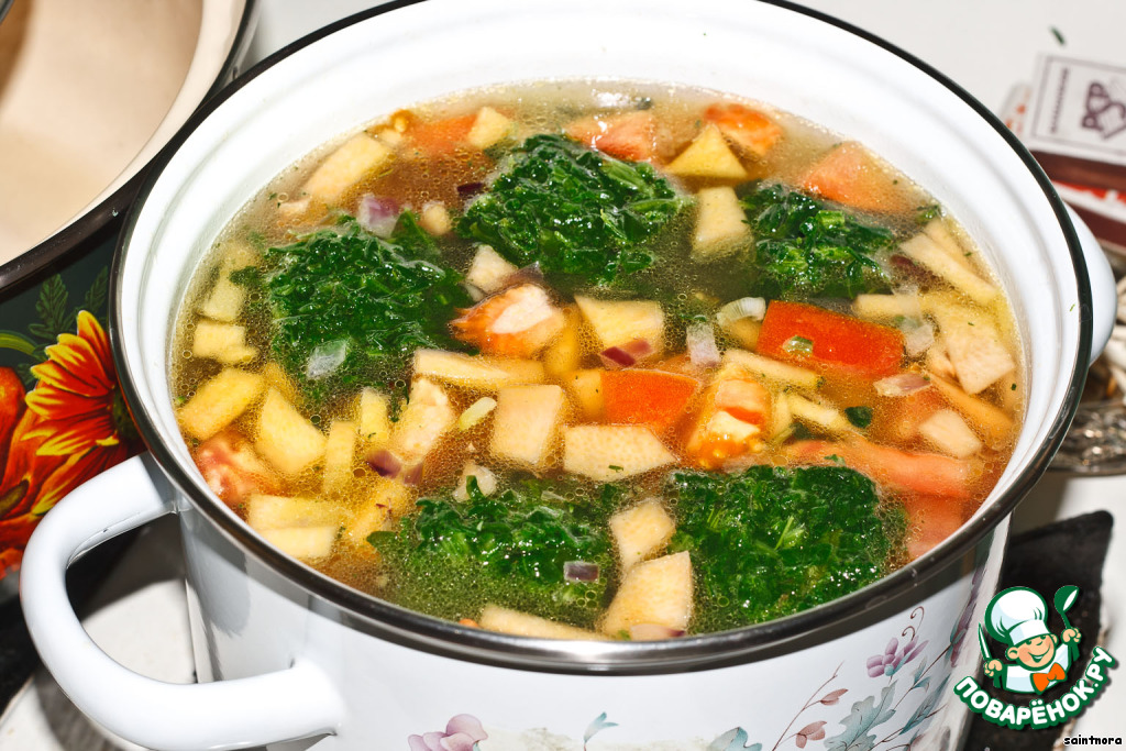 Добавить овощи и остальные ингредиенты в кастрюлю. Довести до кипения, уменьшить огонь и варить примерно 20 мин., пока овощи не станут мягкими.