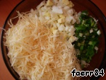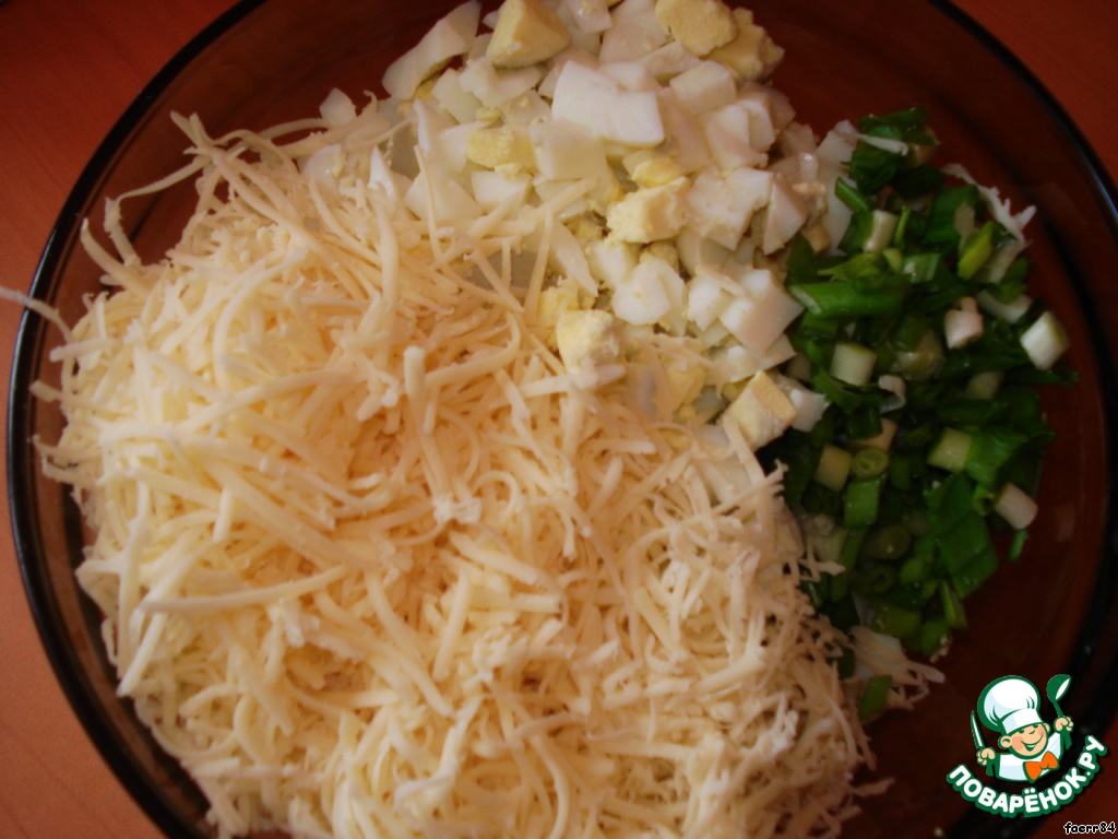 Смешиваем нарезанные кубиками яйца, натертый сыр и зеленый лук.