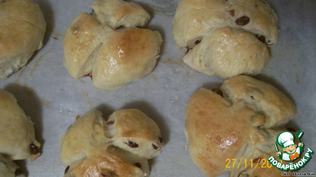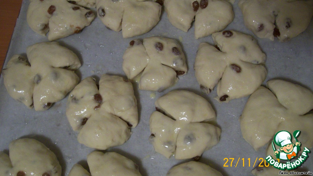 Из сыворотки, сливочного масла, сахара, соли, дрожжей, ванилина и муки замесите тесто. Оно очень легко месится и не пристает к рукам. В процессе замешивания добавьте промытый и просушенный изюм. Я обычно добавляю его после двух стаканов муки. Сформируйте круглые булочки, выложите на смазанный противень и сделайте на каждой булочке по три надреза по направлению от центра, разрезая край. Смажьте взбитым яйцом.