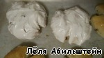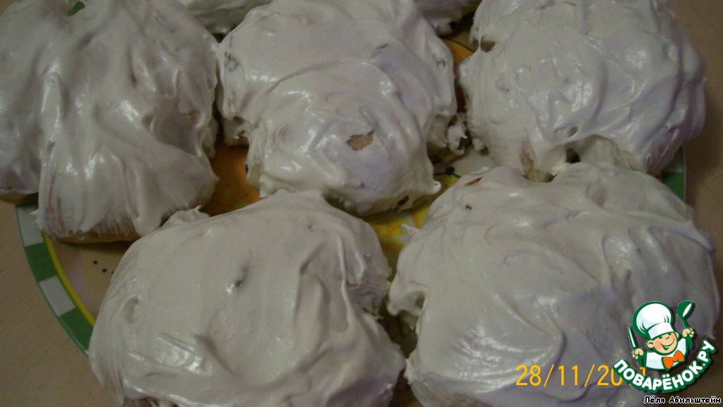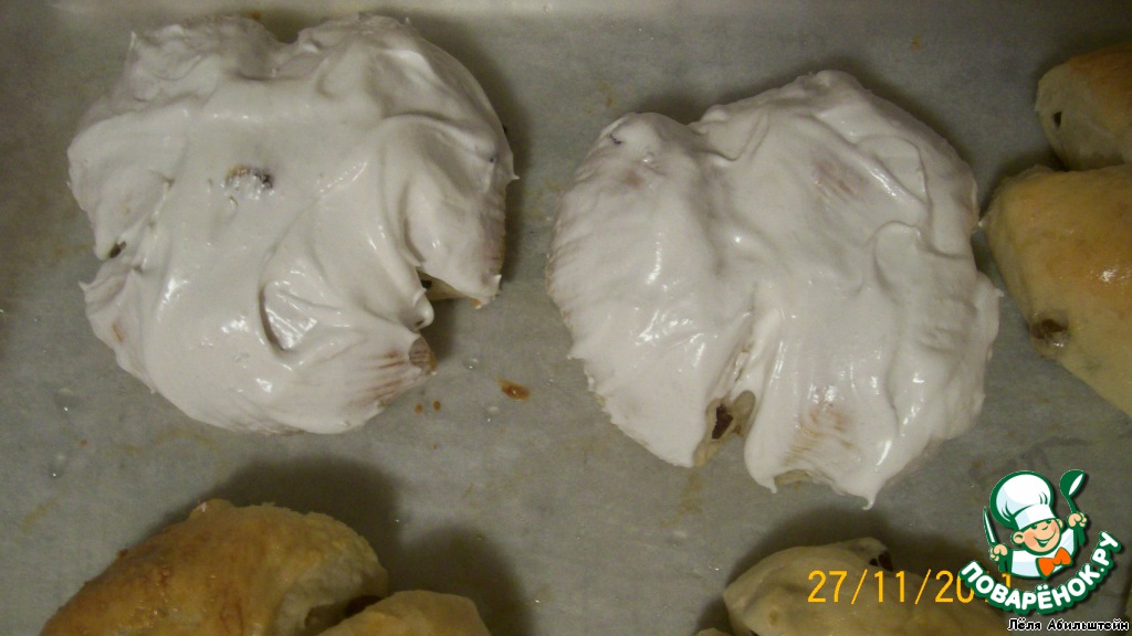Подготовьте помазку. Взбейте миксером холодные белки, в середине взбивания добавьте сахарную пудру и крахмал. Никакого лимонного сока, от него помазка только крошится, когда высохнет! Наша цель - тягучая, мягкая, вкусная помазка! Намажьте ею готовые булочки.