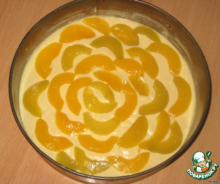 Тесто выложить в форму, разровнять. Сверху выложить ломтики персиков. -