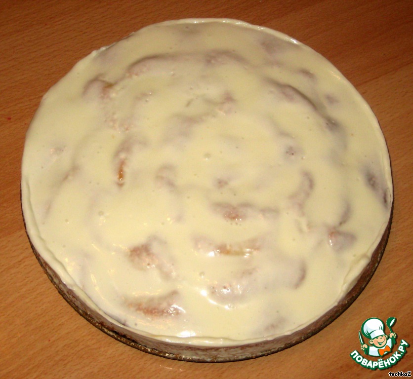 На теплый, не горячий, пирог вылить крем (прямо в форму, не бойтесь, за края бумаги потом легко извлечете пирог вместе с кремом). -