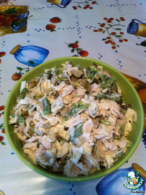 Затем добавляем филе, порезанные яичные блинчики и выдавливаем чеснок. Добавляем майонез и соль по вкусу. Если желаете, можно и зеленью украсить. Но у меня ее не было. Готовому салатику даем охладиться и прошу к столу.