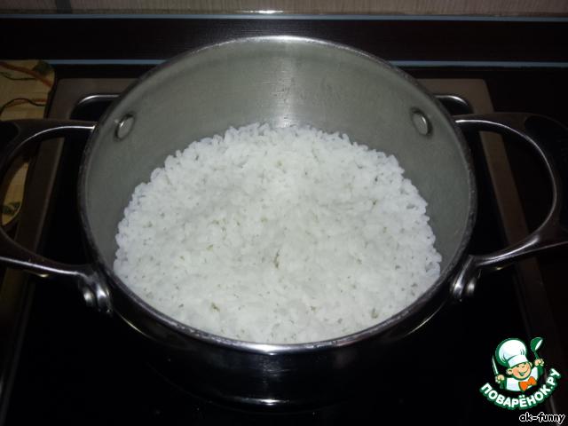 Отвариваем рис. Для получения нужного количества надо взять 0,5 ст., тогда по окончании варки риса станет 1 стакан, как нам и надо.
