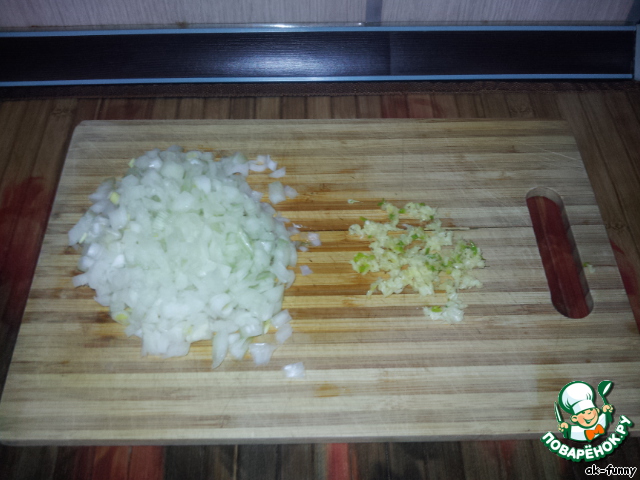 Режем лук. Давим через чесночницу 4 головки чеснока.