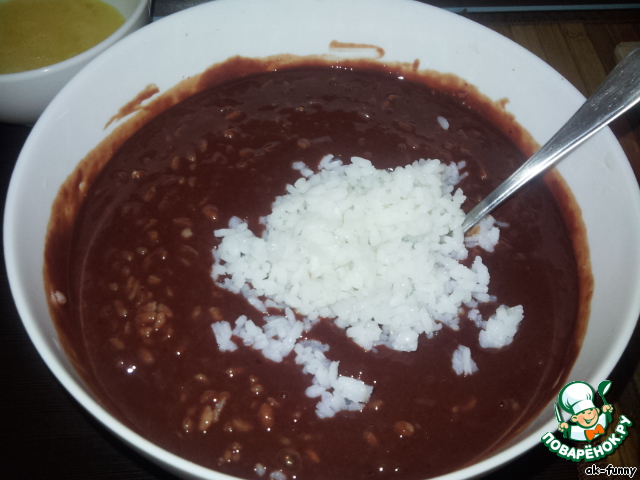 В перемолотую печень выкладываем отварной рис. Перемешиваем...