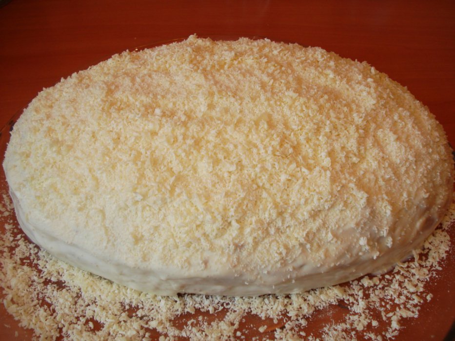 Посыпаем тертым белым шоколадом (имитируем снег, сугроб же все-таки)