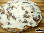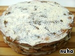 После него - корж с изюмом и маком, также покрытый кремом.
