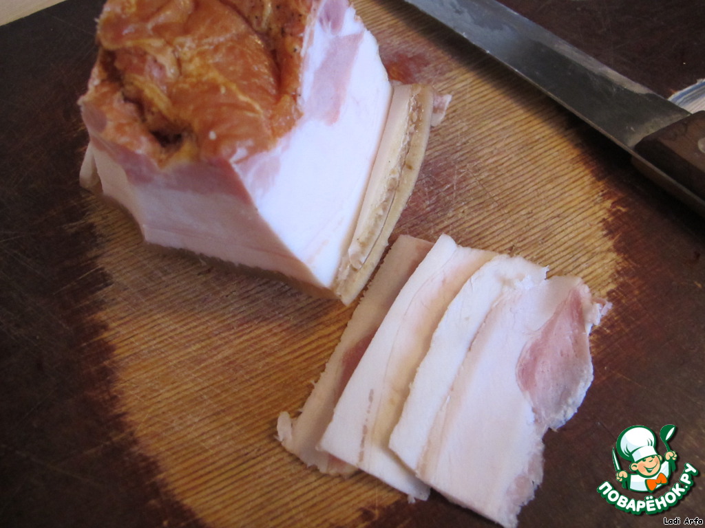 Подкопчённую грудинку нарезать тоненькими пластинками.