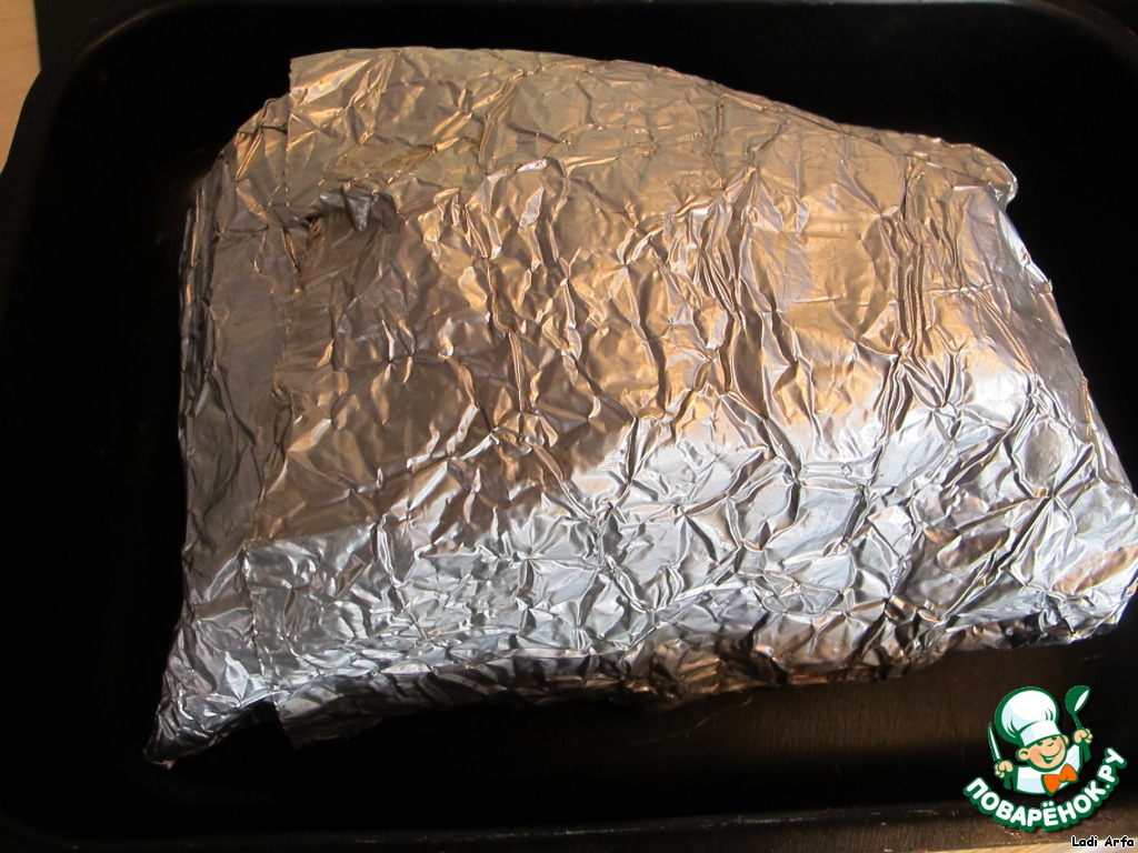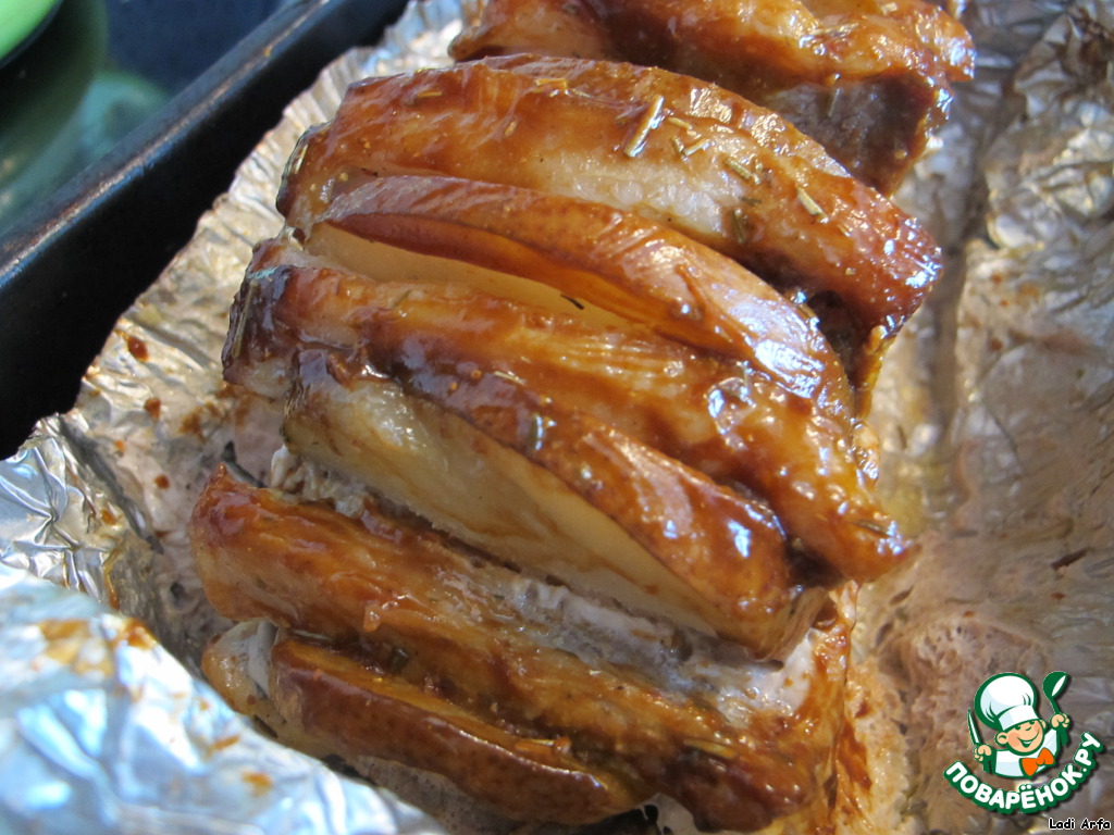 В прорези вложить по пластинке грудинки и груши, посолить, завернуть в фольгу и поставить в разогретую духовку до 200 град. на 1,5 часа
