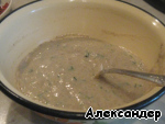Затем грибы измельчаем в блендере до состояния пасты. Добавляем яйцо, муку и соль. Кладем немного зелени. Тесто должно быть, как густая сметана. У меня ушло 4 ст. л. муки, но она разная.