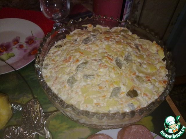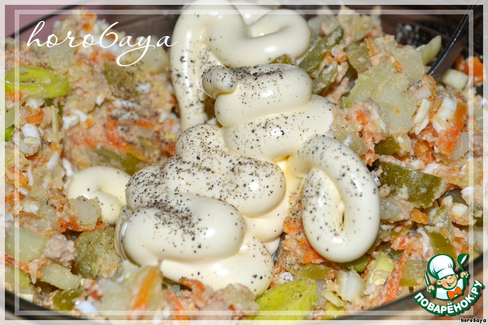 Смешать печень, яйца, картофель, морковь, огурцы. Если необходимо, посолить. Заправить майонезом и 2 ст. л. масла от печени трески.